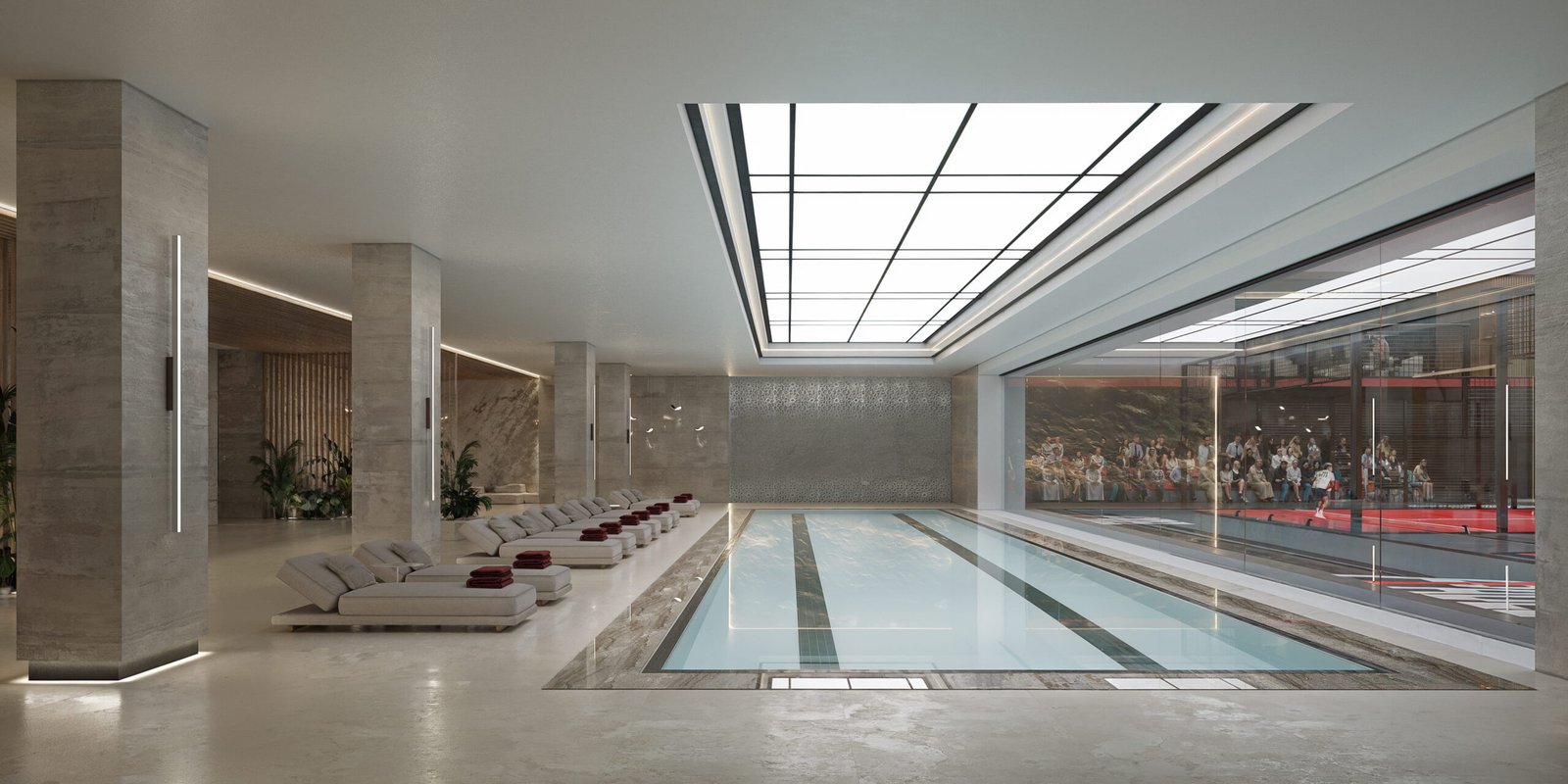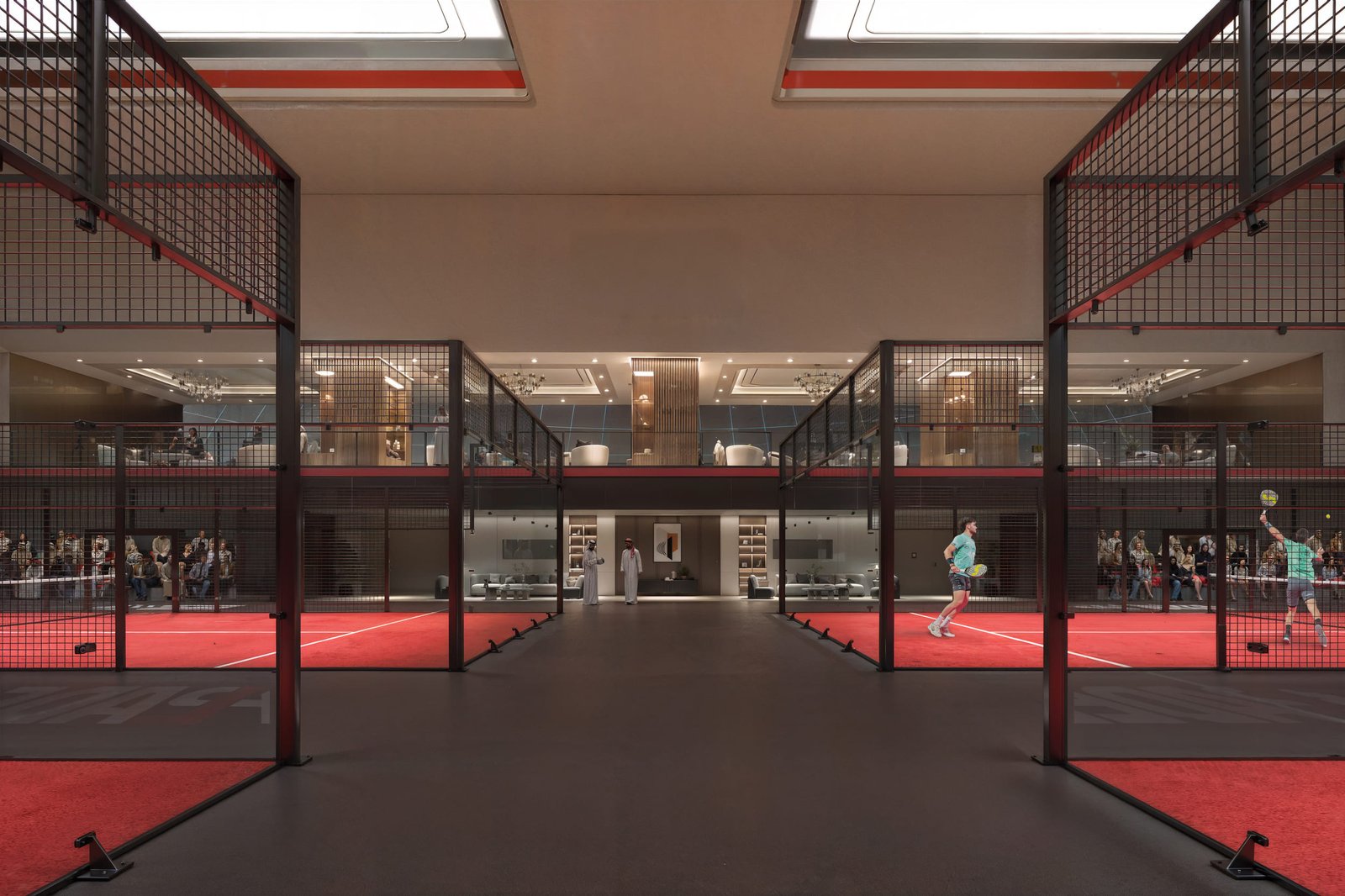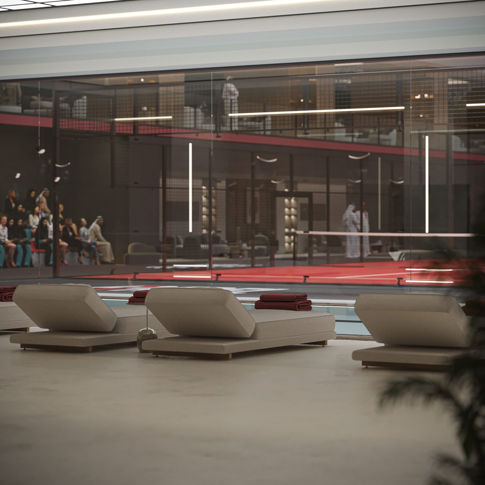 El programa contempla instalaciones de alto rendimiento, destacando un Estadio de Pádel principal equipado con la última tecnología inmersiva, cuyas atmósferas han sido capturadas con gran detalle en las infografías 3D. Además, el complejo dispone de pistas de pádel secundarias y amplias zonas deportivas con amenities VIP, consolidando un concepto de ocio y bienestar integral.